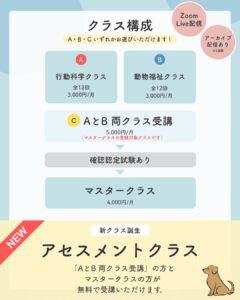 講義の内容に即したクラス名への変更「行動科学クラス」「動物福祉クラス」そして、この度新たに「アセスメントクラス」が誕生いたします!!