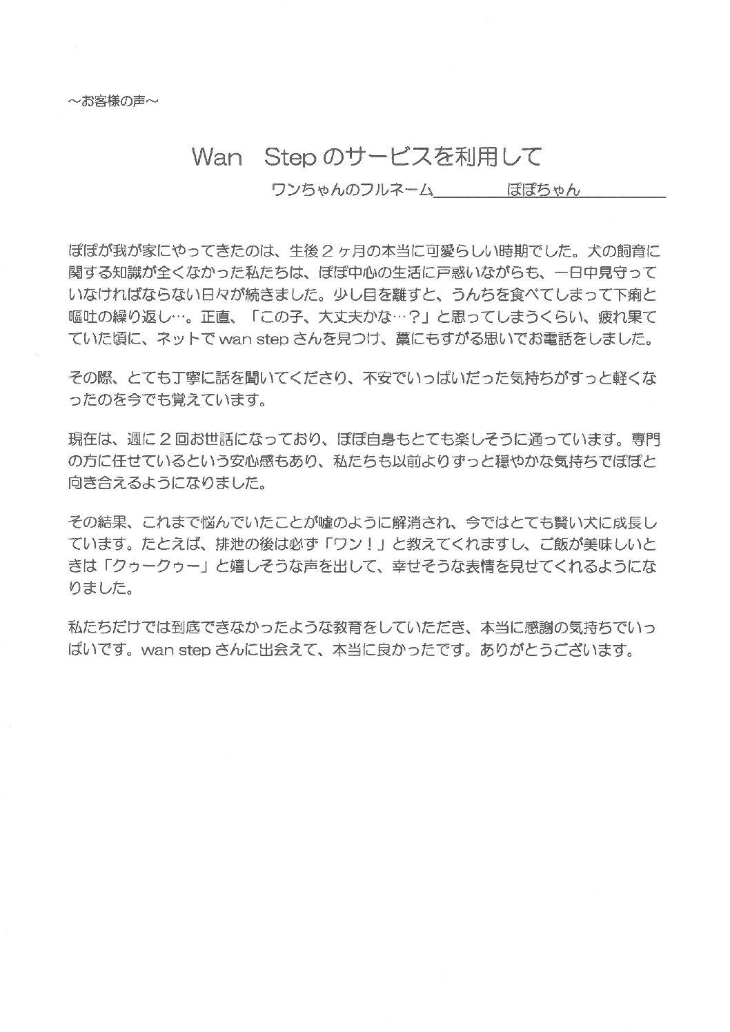 お散歩は常に二足歩行、甘噛みも酷く、どう躾をしたら良いのかもわからず悩んでいた時に犬の幼稚園の存在を知りました。何件かメールで問い合わせた中で、Wan Stepさんのお返事が心地良く、誠実だったので直接お話を伺うことにしました。